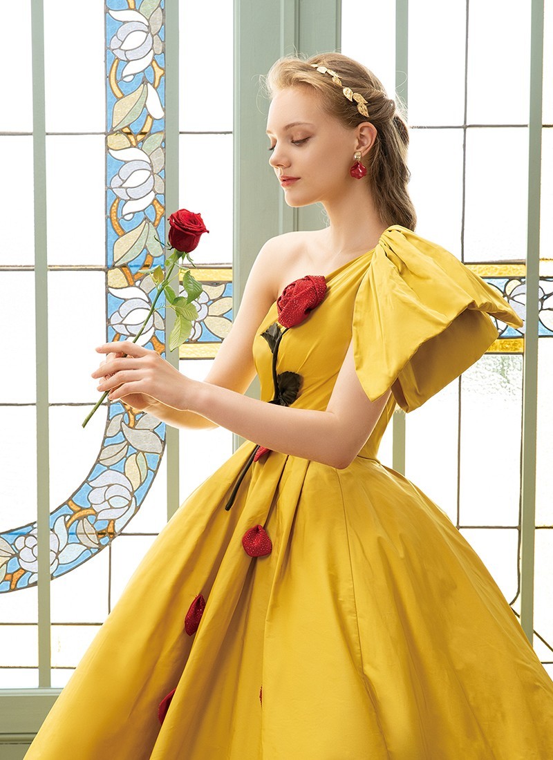 一想到公主 Belle,當然少不了她那種搶眼又充滿復古感的鵝黃色禮服裙!這款婚紗最注目的設計,絕對是鑲在胸前的一朵紅玫瑰,配合散落於裙擺上的玫瑰花瓣,根本就是神還原電影中的唯美場景!配上充滿格調的單肩設計,拍照起來超好看~