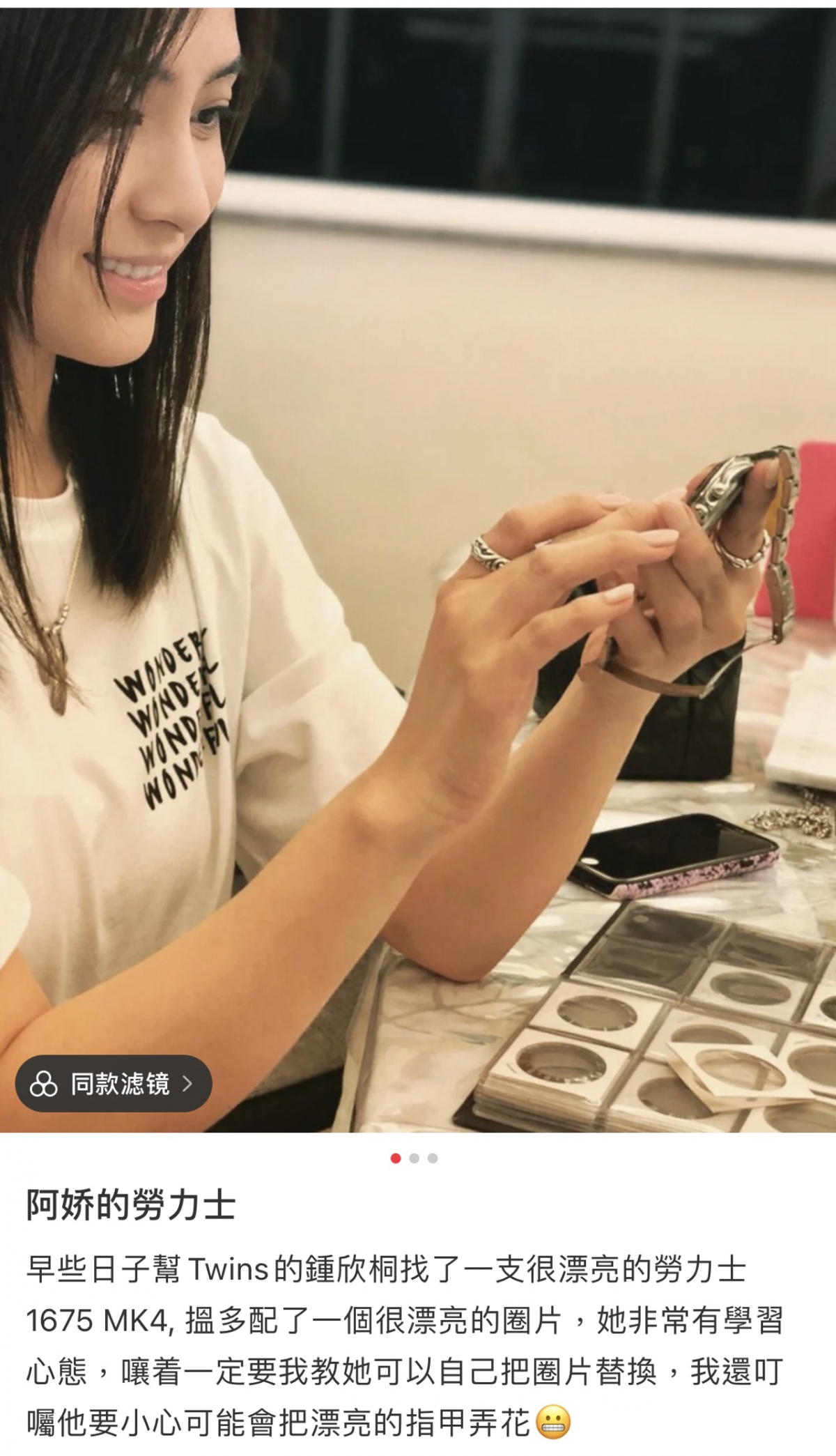 阿嬌在2018年也曾在IG分享過一則帖文,稱自己「最近愛上手錶同銀器 #學人玩研究古董錶」,更配上一張自己戴著Rolex GMT1675 MK4的相片,若齊備天文台認證紙、出世紙書仔等,手錶當時的售價逾20萬。