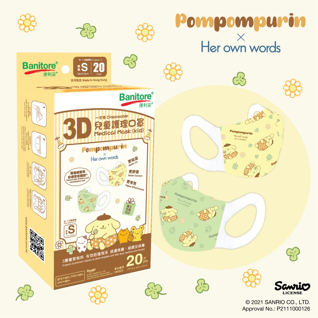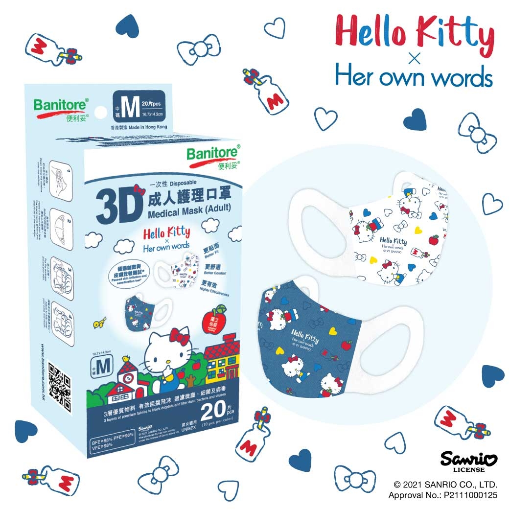 除了內衣及睡衣吸引外,Her own words更聯同Banitore便利妥推出「甜系郊遊布甸狗」及「經典牛仔Hello Kitty」3D立體口罩,吸睛的Hello Kitty及布甸狗圖案已經讓粉絲按捺不住驚喜的表情了!每盒口罩均有2款顏色 (每色各10片),並提供4個尺碼選擇 (XS碼、S碼、M碼及L碼),一家大小一起佩戴也十分適合~口罩的防護程度更是符合嚴格標準:BFE/PFE/VFE ≥ 98%,絕對是可愛度及安全性兼備~