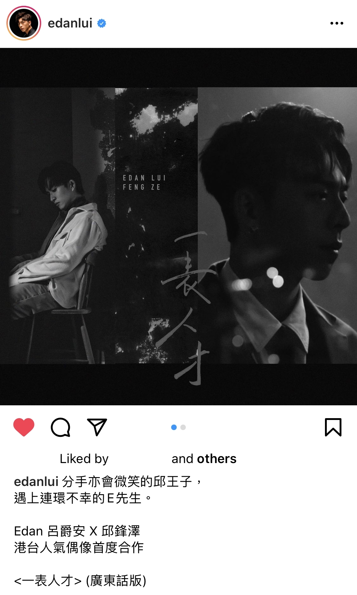 Edan也曾透露過今年會再出新歌,11月16日晚上9時就正式在IG向大家公佈將與台灣人氣「狼人殺偶像」——邱鋒澤合作,更是一曲兩個版本,分別是《年青有為》(國語版)及《一表人才》(廣東話版),光看到歌名已經覺得與兩位小王子很貼切,加上黑白風格的照片已經令人既驚喜又期待滿滿!