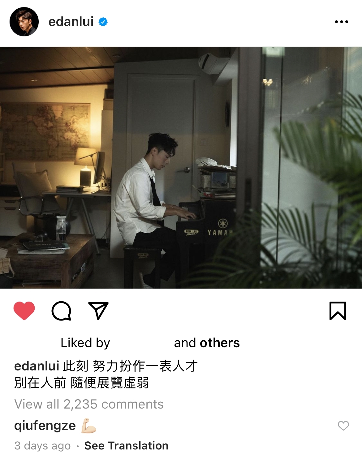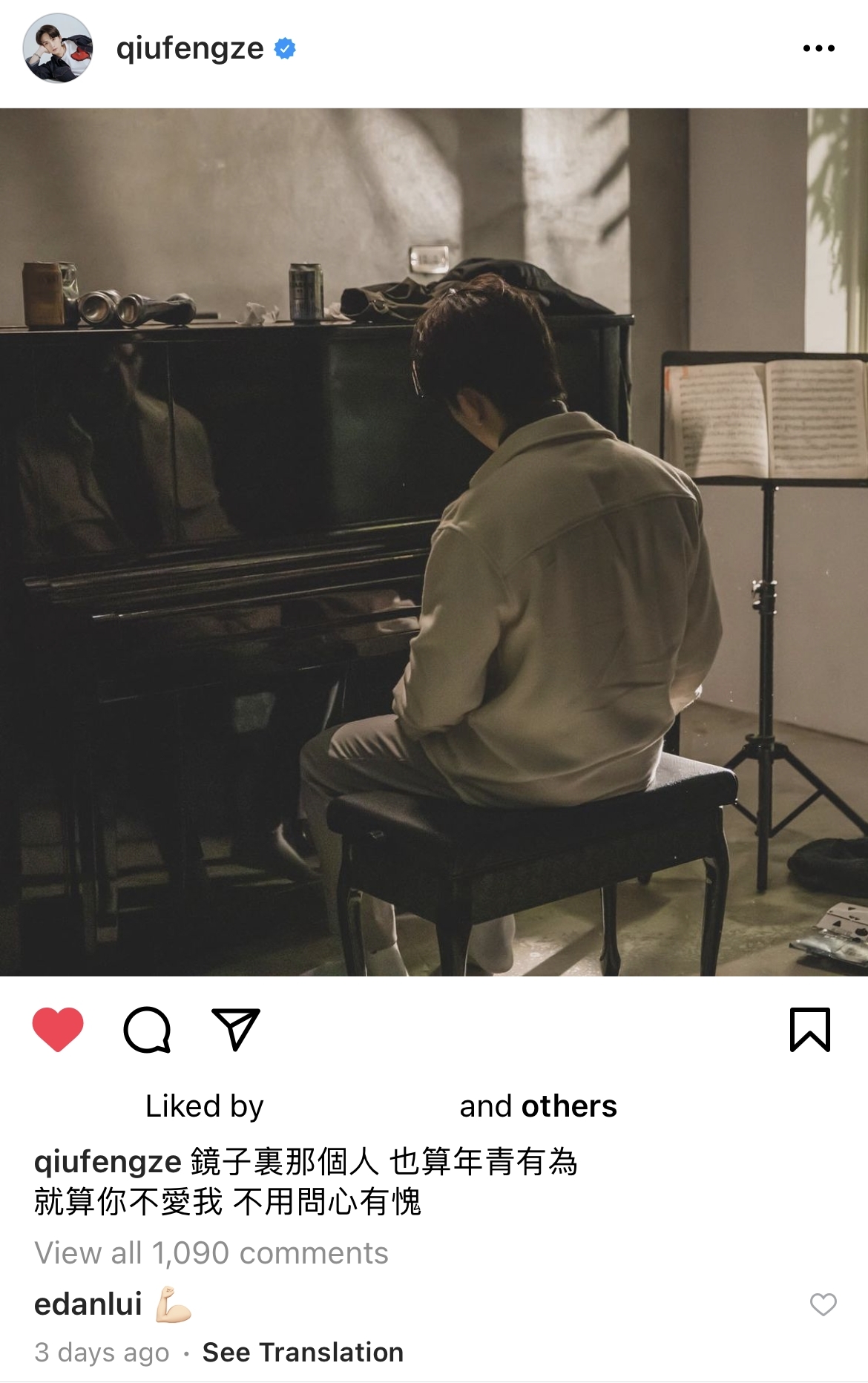 早在幾日前發現兩人各自在IG上發佈了一張相似的彈鋼琴背影相,並配以幾句字句,疑似是新歌歌詞,兩人更在留言區互相留言「加油」的打氣符號,令人好奇兩人的關係,馬上有Fans猜測隔空合作的可能性~
