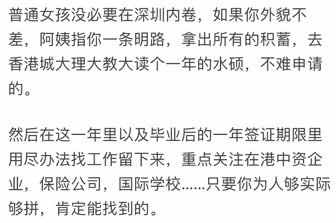 這位自稱「阿姨」的網民就建議樓主不必留在深圳打拚,教她來港讀一個「不難申請的」碩士課程,畢業後就「用盡辦法找工作留下來」,更講到如果樓主有了工作簽證就可以「慢慢混嫁人這條路」。
