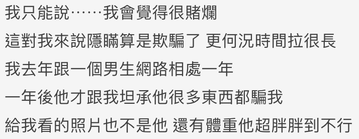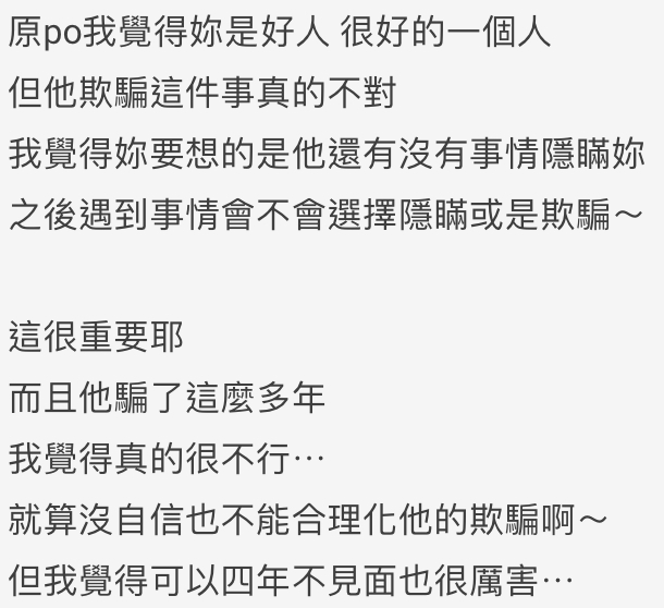 雖然這個故事看起來很溫馨,可是也有很多網民看到了背後的隱憂,覺得「感動不起來」。很多留言都提到無法相信樓主和對方沒見過面就談戀愛四年,而最大的問題在於男生居然一直欺騙樓主,就算因為自卑而無法坦白,最多也只是瞞一年半載。甚至有人直斥:「覺得這男的根本是騙子,讓女生產生依賴和感情之後瞞不住了才坦白」。