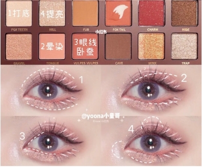 打底色以淡淡的米色為主,疊加淡珊瑚色來暈染,下眼線可用較深的珊瑚色來畫,塗上閃亮眼影提亮後,用白色眼線筆在上下眼尾的位置勾畫2-3條小睫毛便完成~