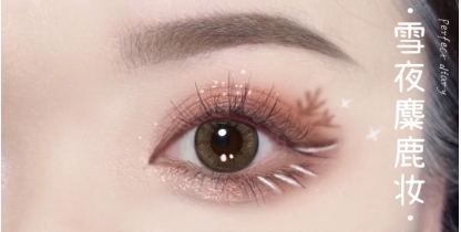 說到聖誕都會想起馴鹿,以淡淡的珊瑚色作大範圍打底,再用啡色眼影來加深眼睛輪廓和眼尾的部分,同時可以當作眼線使用,感覺會更柔和~加上淺色珠光來打亮卧蠶和眼蓋中間位置。接着以啡色眼影和一枝扁平的眼影掃,在上睫毛的外角畫出兩隻簡單的小馴鹿角~最後用白色眼線筆在下睫毛和眼尾加上幾筆作小點綴~