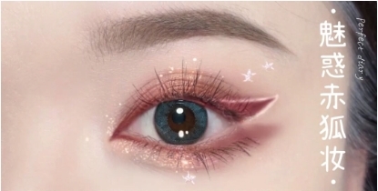 小狐尾的眼妝則比較突出~整體眼妝以紅棕色為主,重點在內眼角和上下眼角勾畫出一條小狐尾,給人一種小性感又魅惑的感覺~再加上金色亮片眼影更加閃耀!可以再用白色眼線輕輕勾畫狐尾,令它更突出~