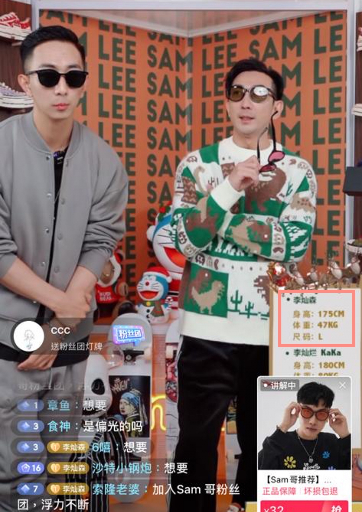 不過直播過程中有個細節比起產品更吸引眼球、甚至震驚網民!直播畫面右邊展示了二人的身高、體重、尺寸供觀眾參考,可是李璨琛身高175cm,體重卻只有47kg!這個數字比起不少女生的體重還要輕,網民都覺得不可思議,紛紛在直播間對李璨琛的體重提出疑問。後來李璨琛見到大家的留言,就回應自己其實有67kg,相信是工作人員的失誤,才令畫面顯示錯了他的體重,真是虛驚一場!(笑)