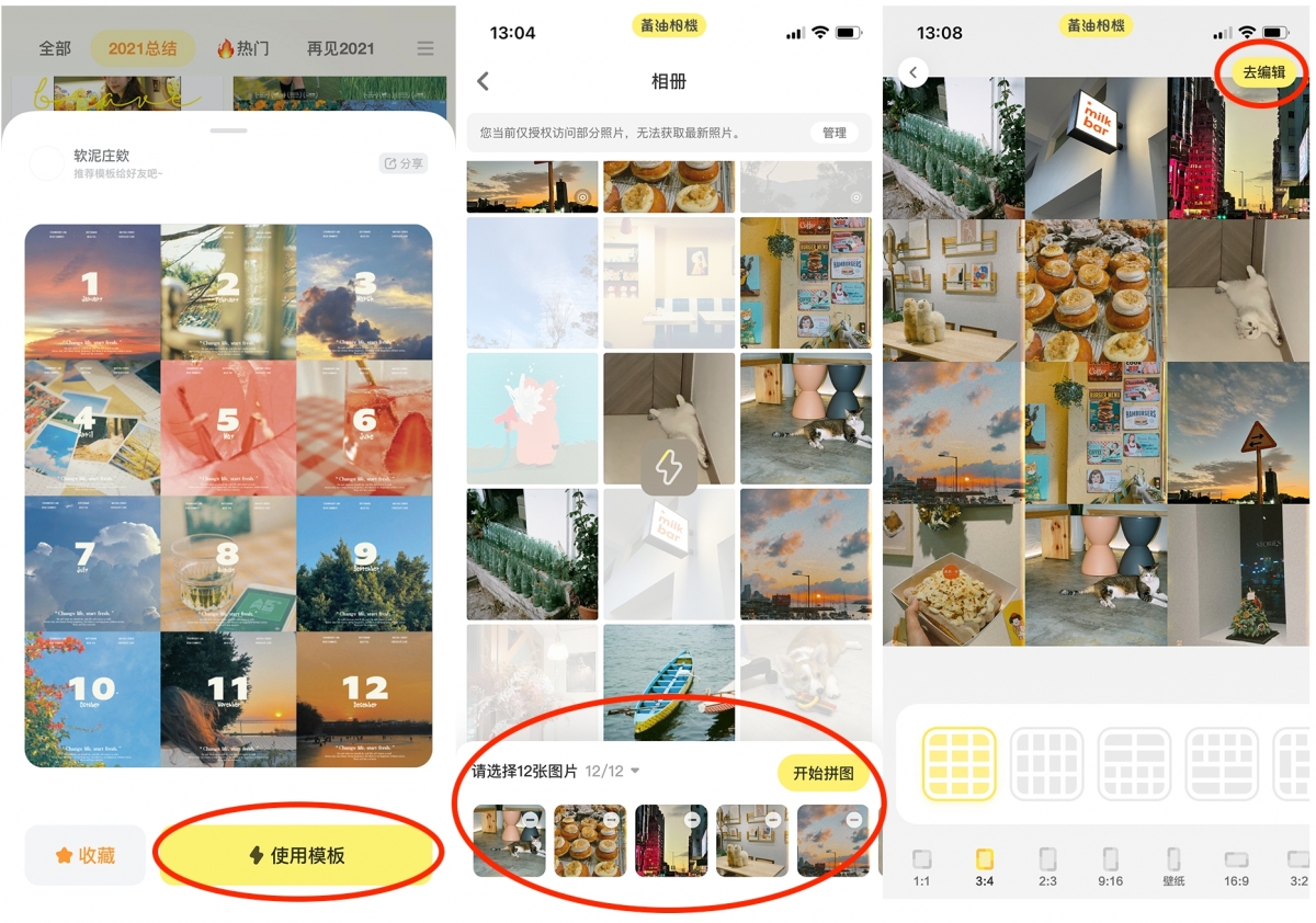 揀好想要的模板便按「使用模板」,再從相簿中揀想用的相片,APP便會幫你製成12格的拼圖,過程中長按小圖可以調位置或編輯,排成你想要的效果,完成後按「去編輯」!