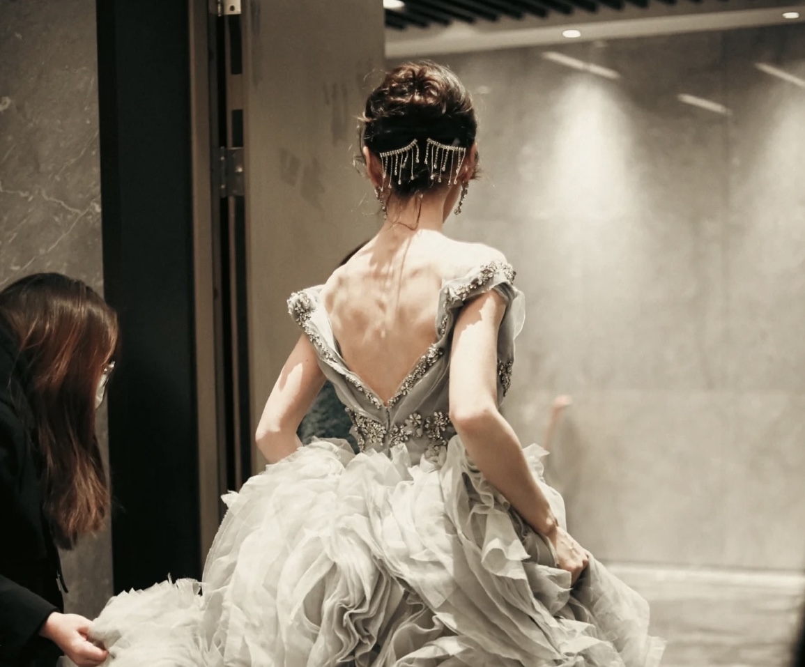幕後花絮照片展示了Angelababy正在被整理造型的模樣,精緻的側臉固然漂亮,但她露出的後背就很明顯的瘦得「見骨」!在光線的映照下她的脊骨和肩胛更加突出,瘦得沒有肉似的,令人不禁擔憂她的健康狀況:「是不是患厭食症了?!」