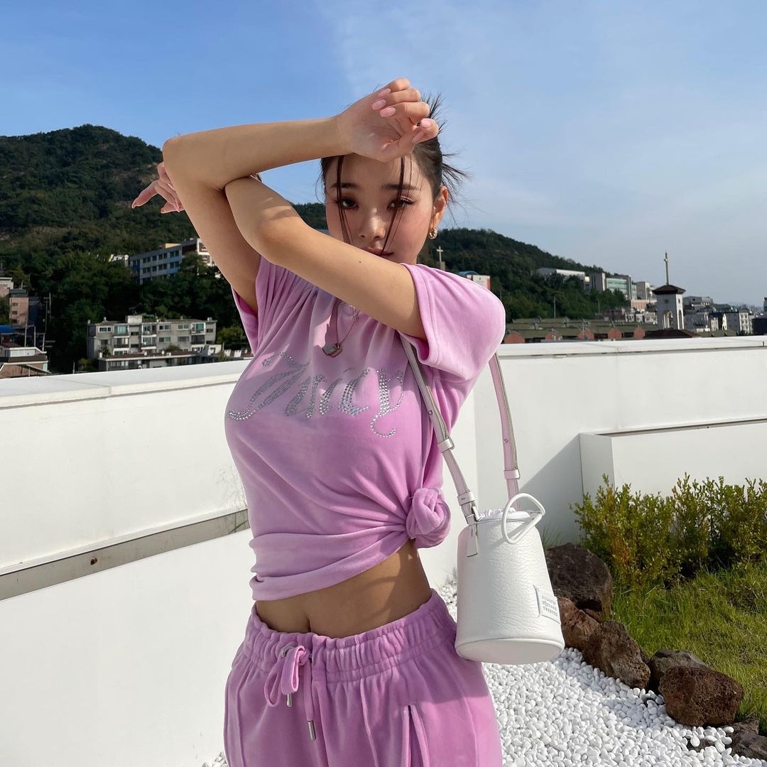 連普通運動服套裝都是絲絨質地,並會把上衣綁起一邊,稍微露出腰線,有看點之餘又顯身材~