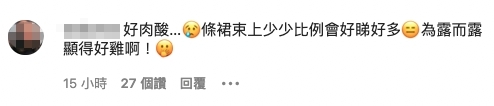 但之後再換上另一條低腰超短裙的造型就震驚網民,照片中的她穿著短版上衣,再配搭低腰超短裙後,令到身材比例變得好奇怪,更差點走光。