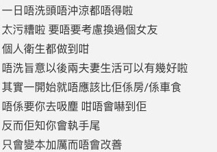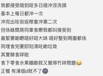 首先樓主提到雖然不少人會認為男生的生活習慣較差,但事實上樓主女友的生活習慣令他接受不到。第一點,女友會用沒有外出為理由五天不洗頭,甚至經常不洗澡就上床睡覺,樓主表示如果女友到自己家中過夜一定會逼對方洗澡。