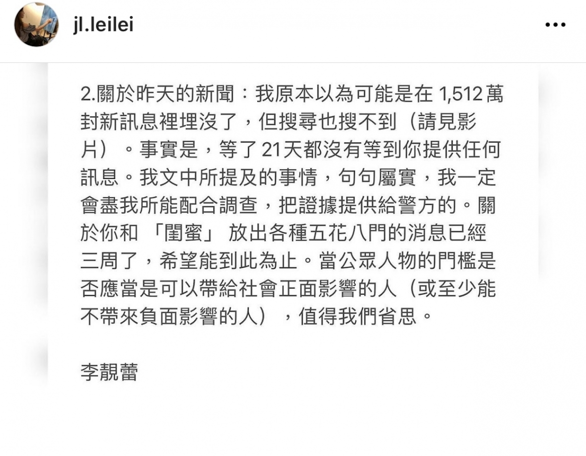 李靚蕾表示自己並非如王力宏所說那樣萬般阻攔王探望兒子,而在網上自稱是BY2閨的控訴也全是虛有,她能向警方提供證據,證明過往說的全是事實。