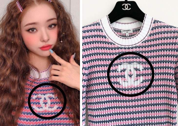 第四,網民又找出宋智雅在節目中曾穿過一件印有Chanel Logo的針織上衣的Logo字型、顏色,甚至是條紋都明顯與真品有出入。