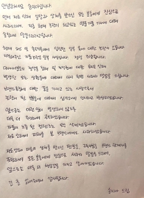 在相關報導引起網民熱烈討論不久後,宋智雅在IG發出道歉文,承認自己在拍攝節目時,的確穿著了不少名牌仿製品,對設計師深感歉意,很多網民都對她很失望。