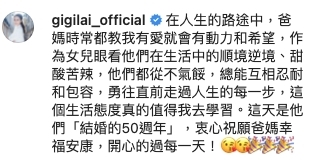2020年黎姿父母慶祝結婚50周年金婚紀念,黎姿亦有和老公一起出席,她又留言要學習父母的婚姻之道,兩夫妻要互相包容走過順境逆境。