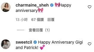 黎姿(現名馬黎珈而)和商人馬廷強結婚13周年,罕有地在社交網上放閃並貼出和老公的合照,又甜蜜寫下「愛的宣言」, 感謝老公給予她13年的開心幸福,她的藝人好友佘詩曼、汪詩詩以及大批網民紛紛留言祝他們繼續幸福快樂下去。
