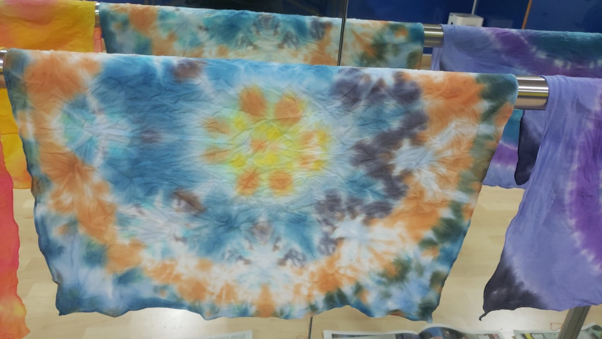 另一個彩染曼陀羅工作坊則需時2小時。親手嘗試於布品上染出一個個幾何曼陀羅圖案,同樣治癒,亦有助帶引情緒平靜~同時會加送彩染小⽅巾或小布袋工作坊,超抵玩!