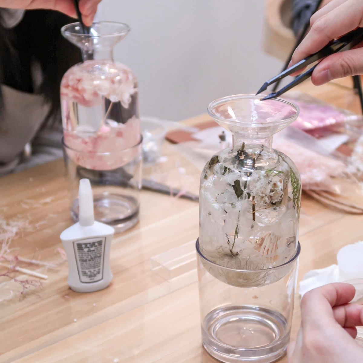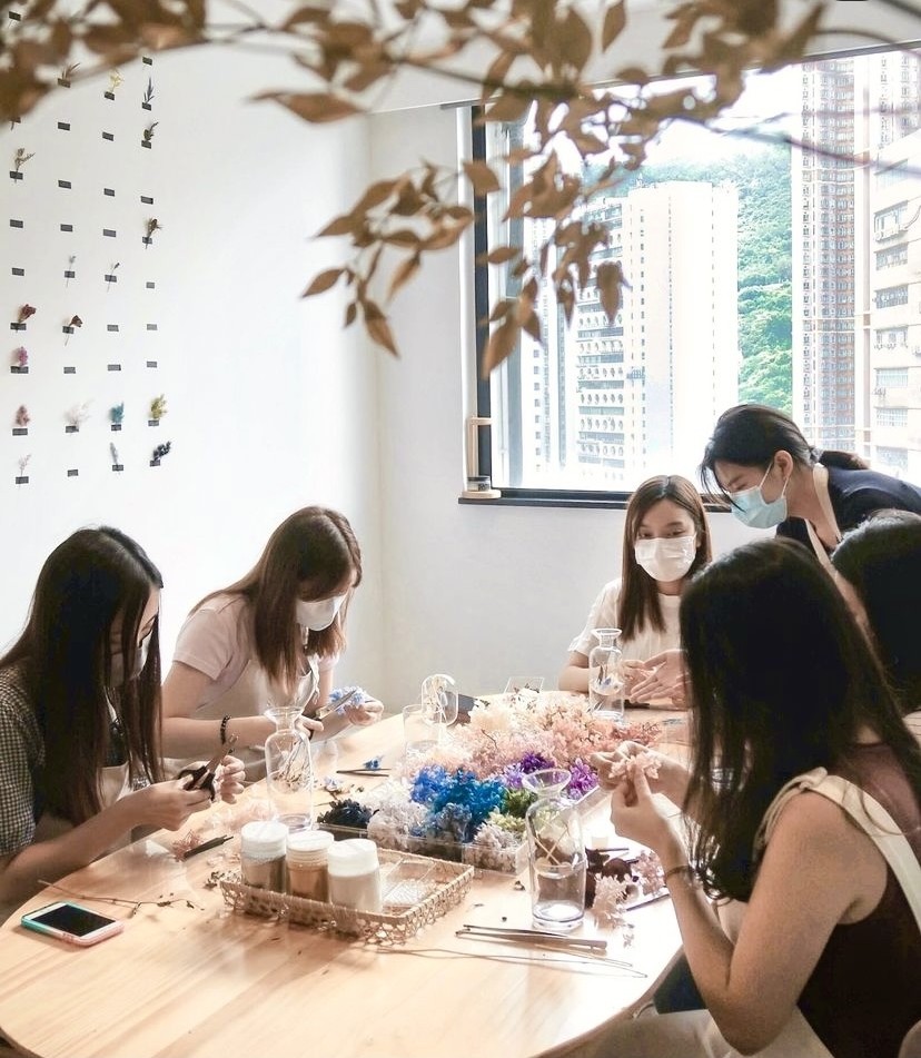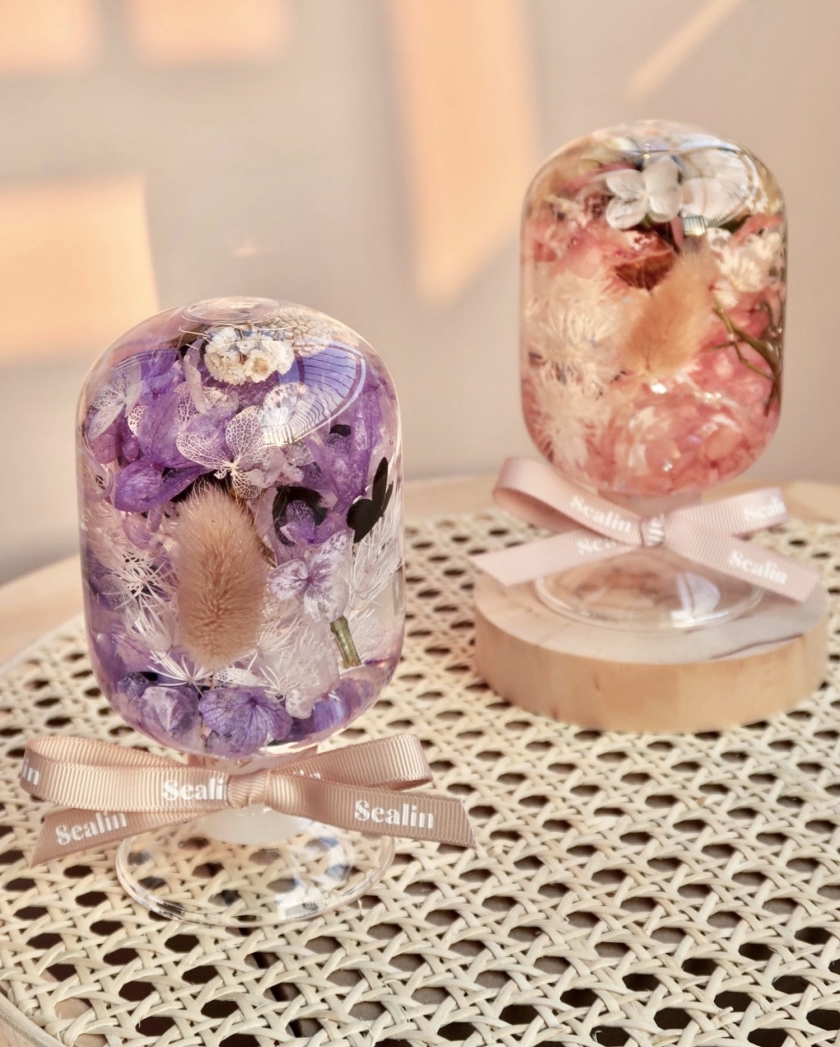 工作坊會提供200多款花材讓大家自行選擇自己喜愛的顏色和風格。利用浮游花專用油液將花朵最美的一刻凝住,當搖晃玻璃球時,內裏的浮游花便會浮動,超療癒!