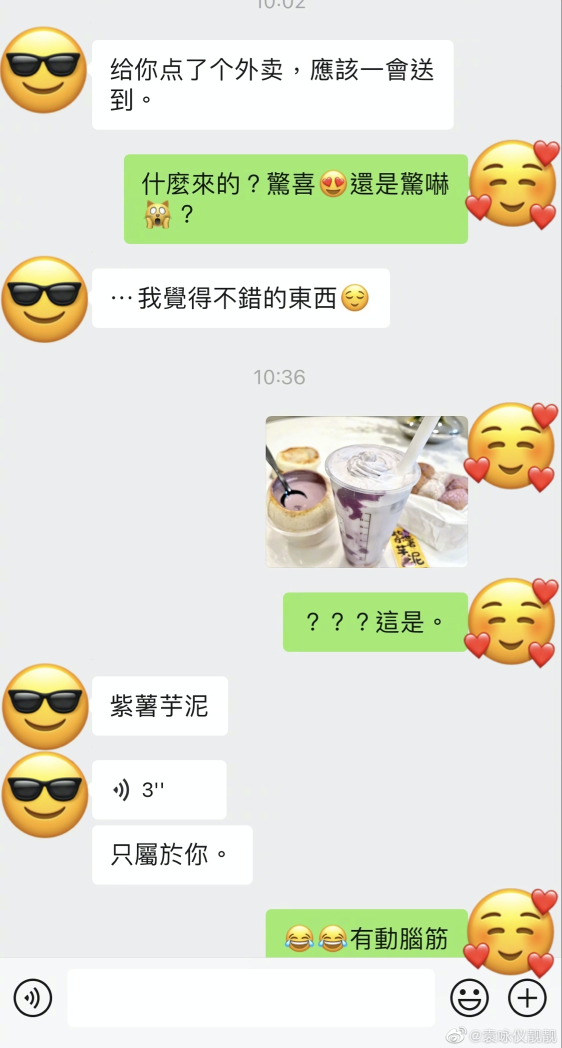 靚靚在微博上載了一圖片和一段對話,原來張先生突然為她準備了一份外賣,原本她還搞不懂背後意思,後來知道「紫薯芋泥」的國語諧音就是「只屬於你」後就甜到入心了。