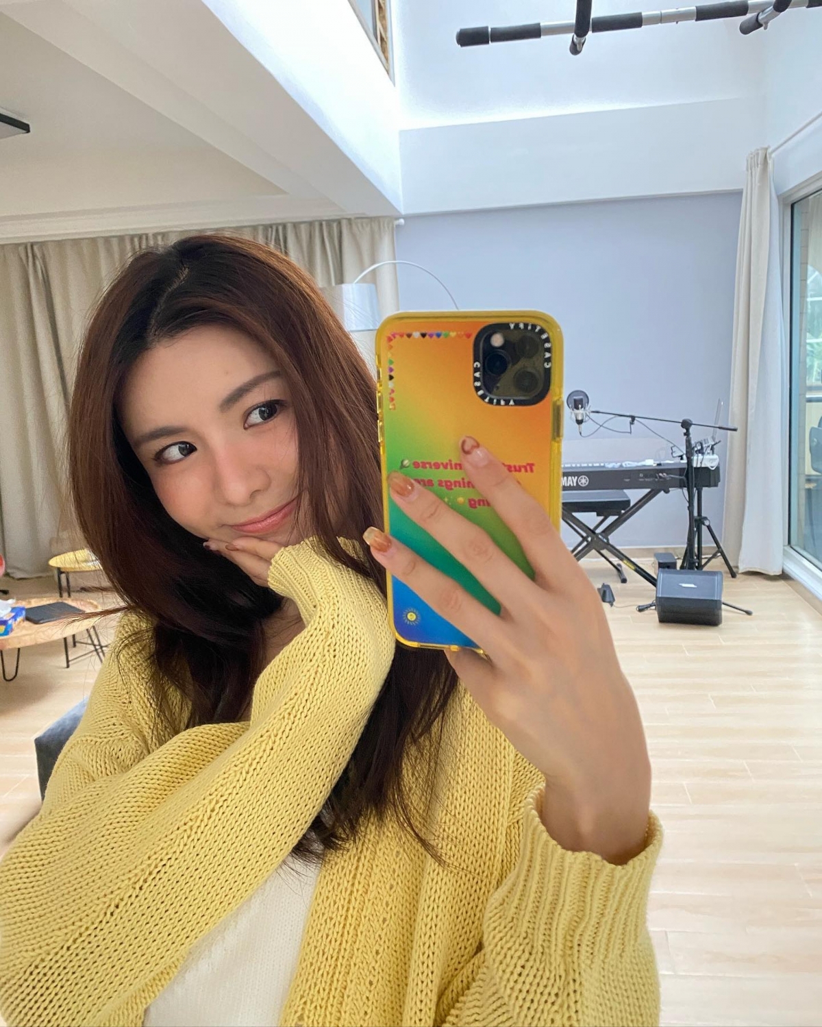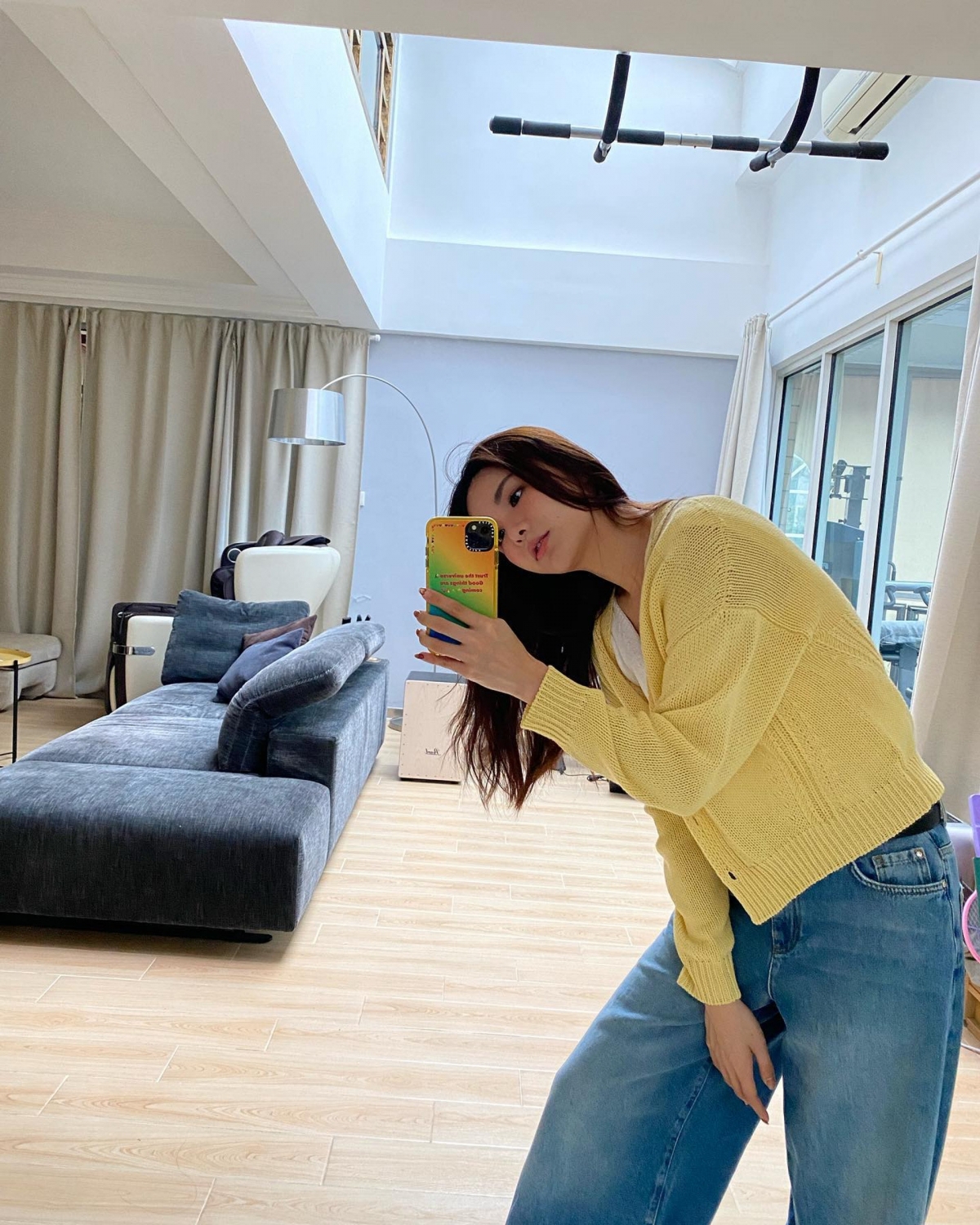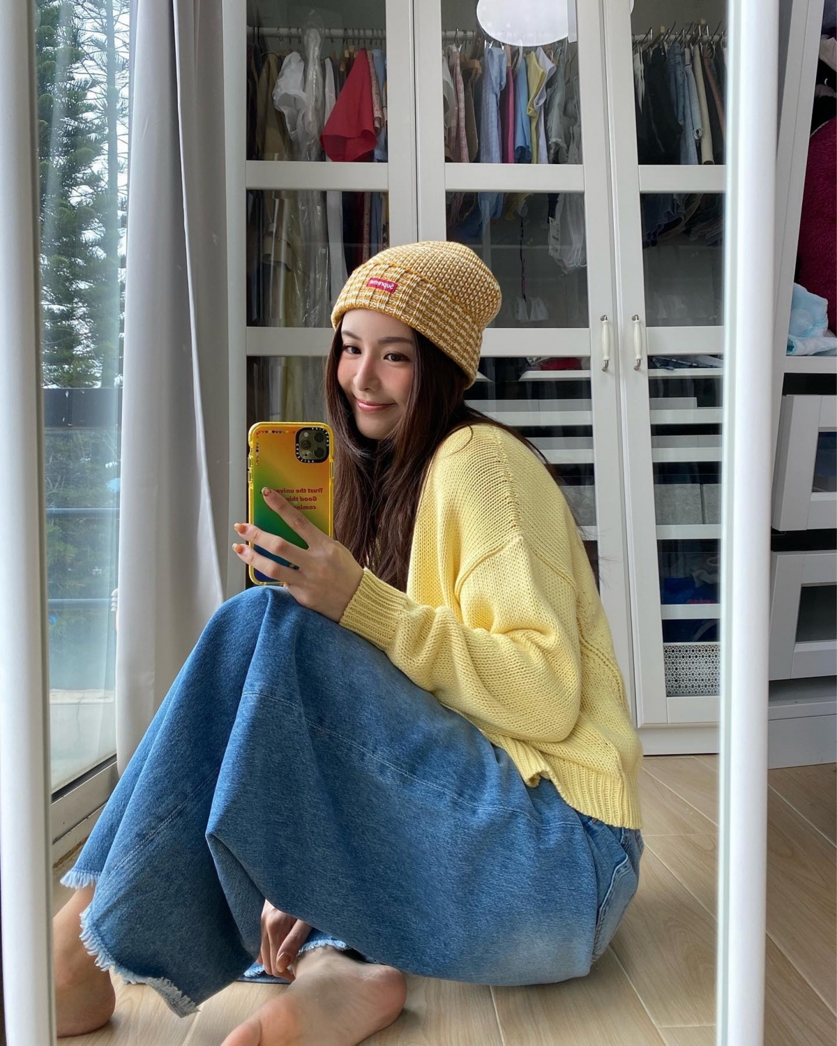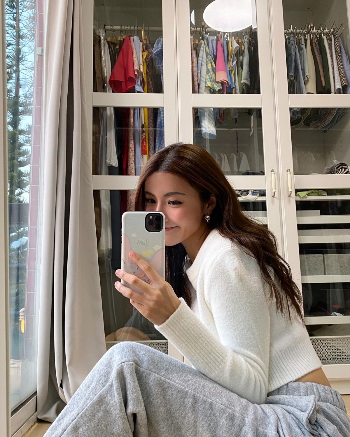 陳欣妍不時在睡房的全身鏡前打卡,從照片中可見房間放了一個白色大衣櫃,裡面大部分都是她的衣服,更可以發現窗外有一個露台,可以看到外面景色優美,每天早上起床就可以享受陽光,相當寫意。