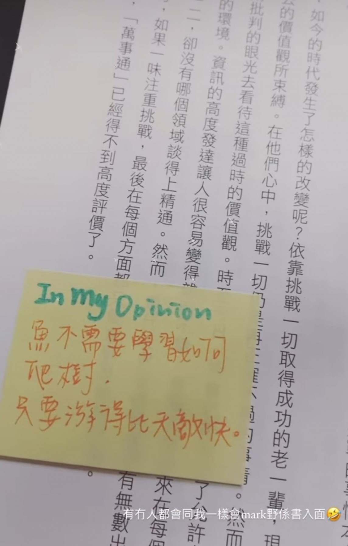 日前Winka就在IG分享了數則限時動態,當中就向大家介紹了一本正能量的書本《不要想太多 要做才會贏》,又提到自己在閱讀書本的時候有抄寫金句的習慣,提到自己當年看這本書的時候,抄下了「魚不需要學習如何爬樹,只要游得比天敵快。」這句鼓勵自己。