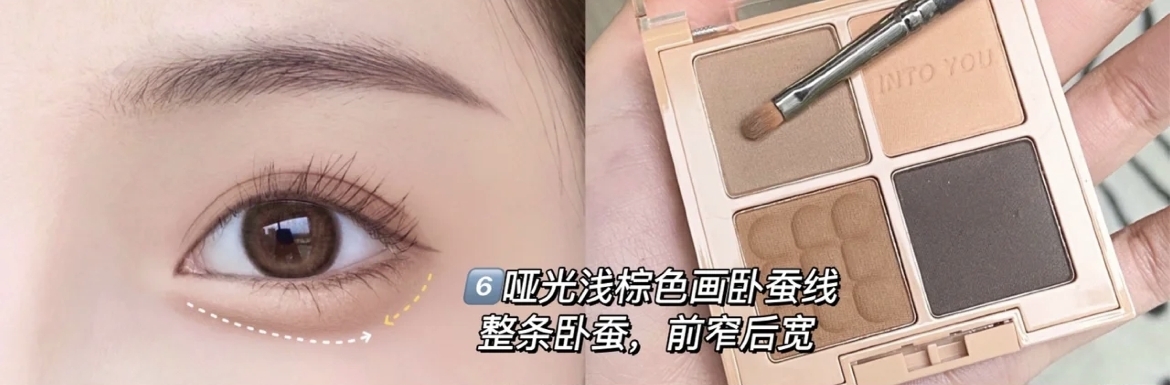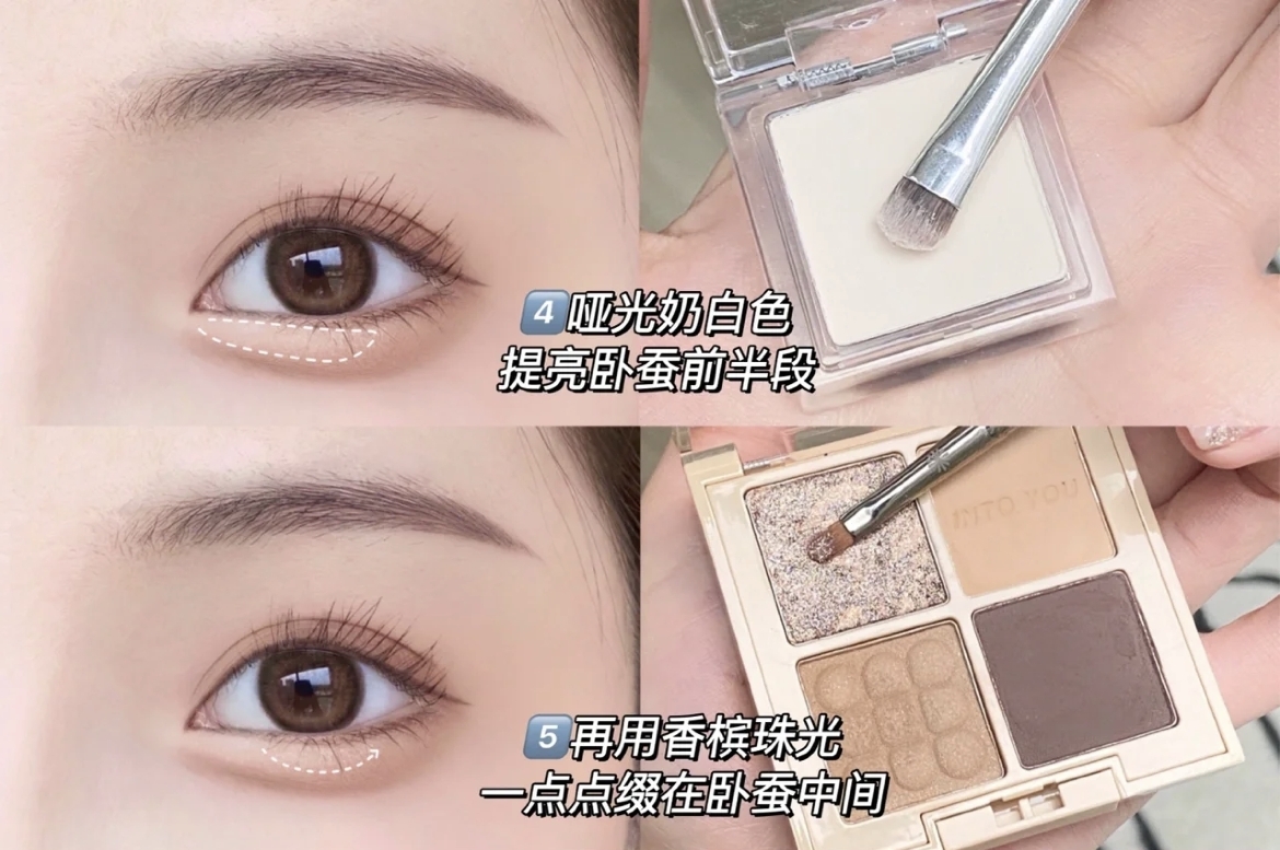 臥蠶重點之一就是要加上打亮,令它看上去有飽滿澎潤的感覺!畫打亮時可以嘗試「縱向臥蠶」的畫法來打亮,美妝博主小刀也有示範過~先用霧面米白色眼影畫在臥蠶的前半段,再用帶珠光的淺色眼影或者臥蠶筆點綴在臥蠶中間。