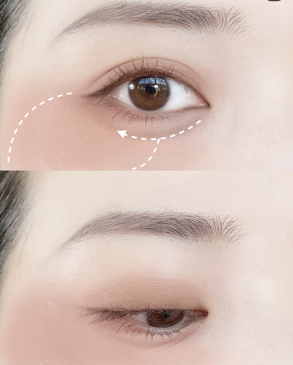根據自己的眼型畫出適合的臥蠶線,先平視前方再跟住下眼瞼的弧度向上勾畫~盡量要與上眼線的弧度對稱。若找不到下筆位也可以對住鏡微笑一下,便會自然呈現出臥蠶的位置。
