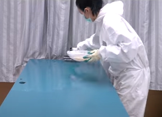 唐寧先把螺絲拆下來, 然後換上一身保護衣,介紹自己要為舊門塗上「脫漆劑」,用於清除門上殘餘的物料,方便一會重新塗漆。片中見唐寧每一個步驟都是親力親為,還詳細講解每一種要用的材料,包括如何挑選想用的油漆和顏色。