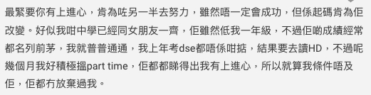 有網民提到自己與女友在中學時期開始交往,自己的成績一般,考DSE亦失準,最後只可以讀高級文憑,但女友仍然沒有放棄自己。指出其實即使本身的家庭背景一般,其實可以靠自己的上進心補救,又鼓勵樓主年紀輕還有很多機會,最重要是兩人真心相愛,是否有心去維繫一段感情。
