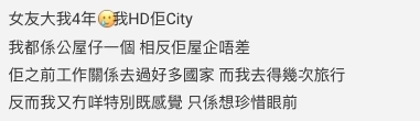 該網民在討論區發文表示自己只是一個住公屋,就讀普通大學成績一般的男生,最近卻認識了一個家庭環境好,就讀頂尖大學並成績優異的女生。兩人在聊天的過程中,樓主發現對方曾去過多個國家旅行,又會幫人補習而有不錯的收入,但自己卻只是去過一個國家旅行,目前只是返一般的Part-time,與女生的條件似乎有很大的出入。