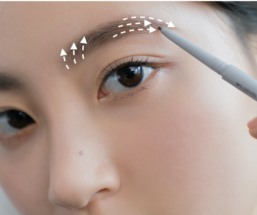 接住,使用眉筆修飾一下眉頭及眉尾的細節位~輕輕地順住毛流方向一筆一筆畫出根根分明的眉毛,記得眉頭部分要向上斜線勾畫,精細地打造出毛流感之餘,還能夠增加立體感~
