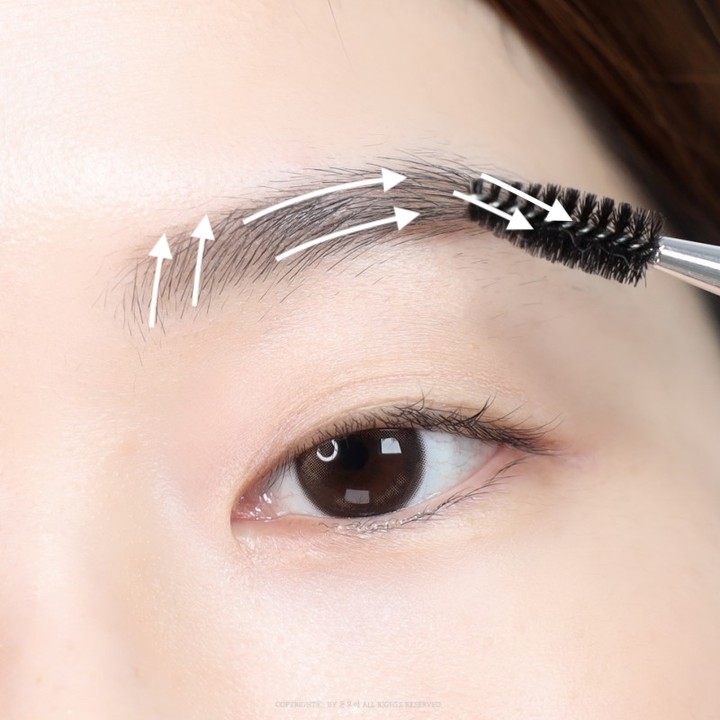 如果眉毛上帶有之前塗抹的護膚品或妝前保養可以先用紙巾吸走,後續上妝才不會結塊,效果更好。畫眉毛前,根據眉型和毛流生長方向梳順,眉頭垂直向上掃、中段順住眉型平行橫掃、眉尾的部位則是往斜下方掃。