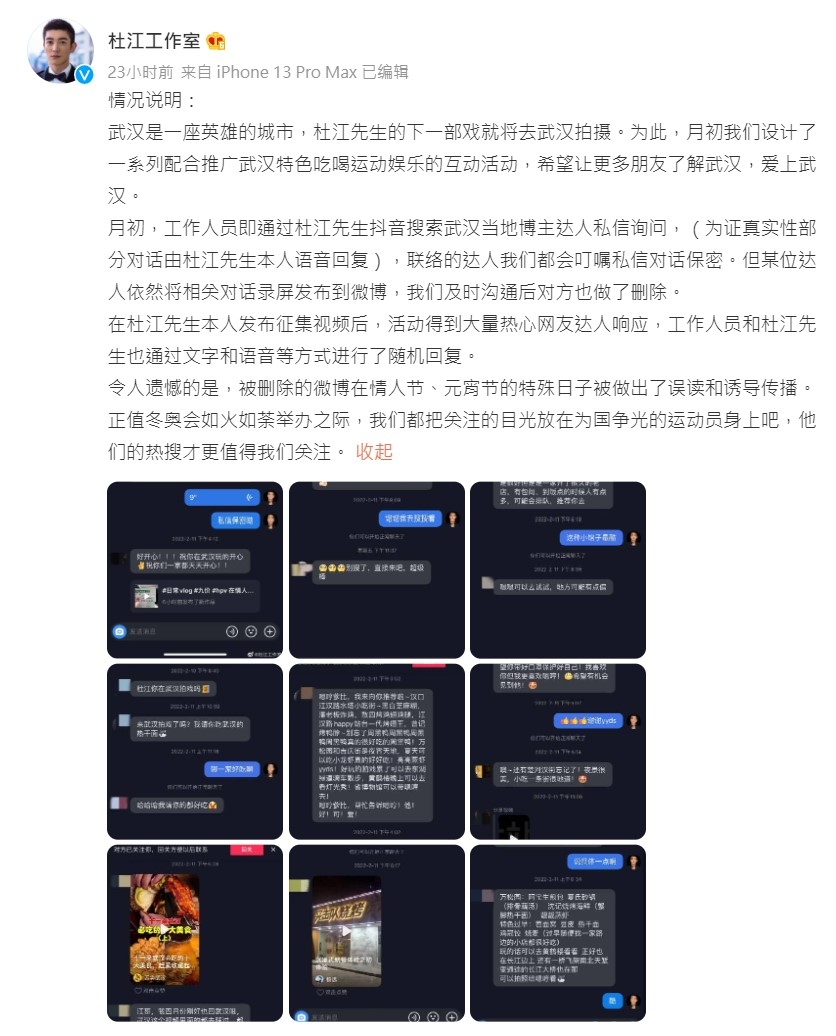 事件在網上持續發酵,杜江的工作室隨即作出澄清,指出是因為杜江的下一部戲即將去武漢,為拍攝一系列介紹武漢的影片,所以工作人員才用杜江的抖音帳號去私訊當地網紅,從而了解當地的美食餐廳及熱門景點。