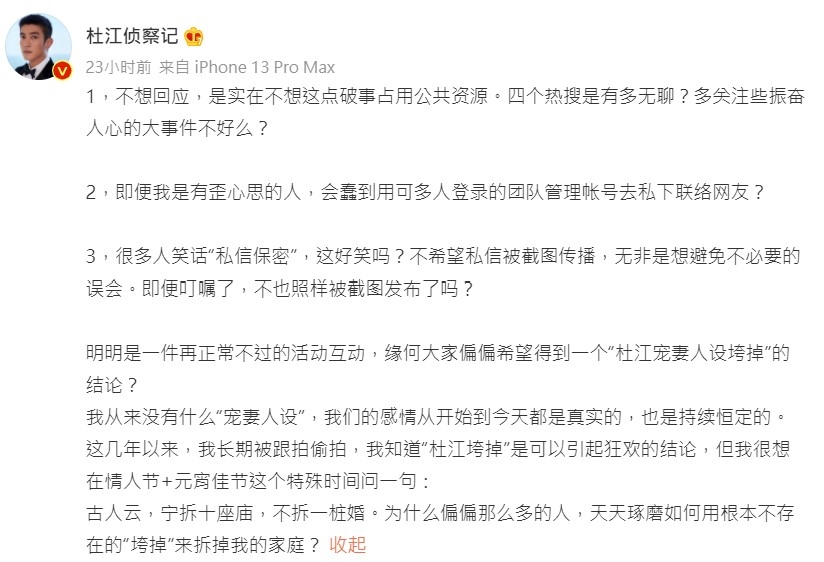 近日網絡上盛傳一張疑似杜江私訊女網紅的對話截圖,截圖中可見杜江的官方帳號向網紅詢問「你是在武漢嗎?」,其後該網紅反問「你是本人嗎?」,杜江則用錄音回覆對方「是呀,因為3月份要到武漢拍戲」,其後又向女方詢問微信聯絡方法,甚至要求要將私訊內容保密,令到不少網民質疑杜江的寵妻人設崩壞。