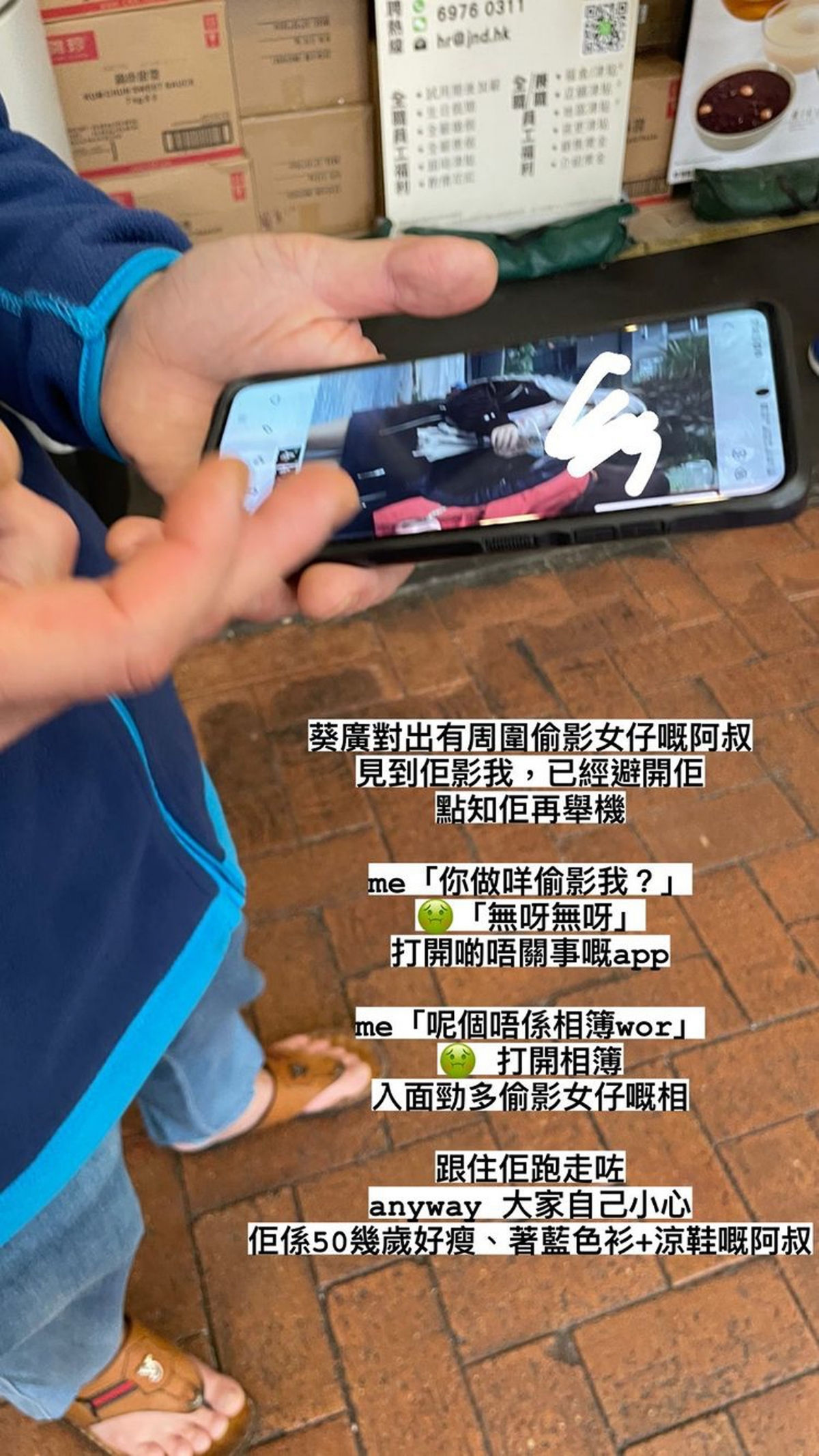 日前李昭南在IG限時動態分享自己被偷拍的經歷,表示在葵涌廣場出現偷拍女生的大叔,發現對方竟然偷拍自己,於是她只好避開,但對方居然再次舉機拍攝。於是李昭南上前與對方理論,問該大叔「你做咩偷影我?」,但對方不但否認,更打開手機內不相關的應用程式,證明自己沒有偷拍。