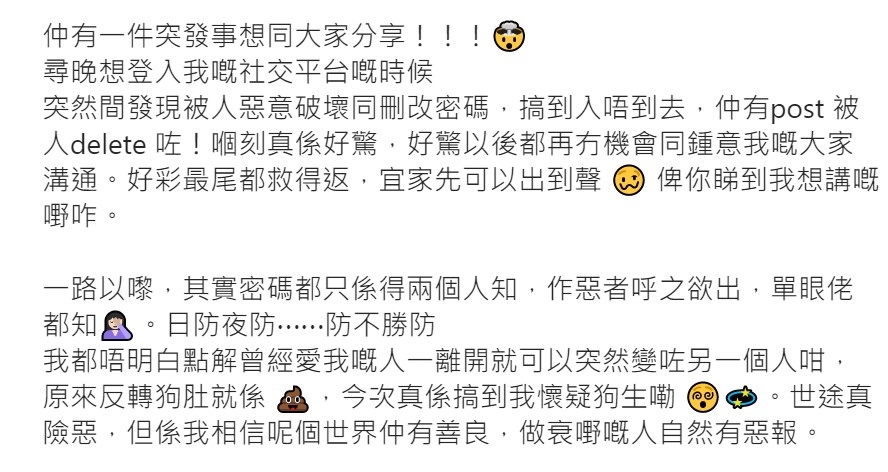 她又突然自爆帳號突然被人更改密碼,甚至有部分貼文被刪除,事實上密碼其實一直只有兩個人知道,「我都唔明白點解曾經愛我嘅人一離開就可以突然變咗另一個人咁,原來反轉狗肚就係屎。世途真險惡,但係我相信呢個世界仲有善良,做衰嘢嘅人自然有惡報。」,疑似暗指男方與自己分手後,完全變成另一個人。