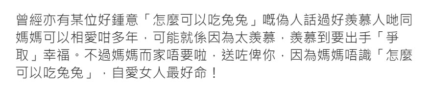 之後前女友亦提到有「偽人」曾指很羨慕自己與男友的多年感情,可能是太羨慕的關係,居然忍不住出手「爭取」幸福。不過前女友就直言「不過媽媽而家唔要啦,送咗畀你」,又指懂得自愛的女人最好命!