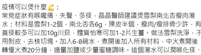 註冊中醫師黃晶晶就在個人專頁分享了自己確診後,如何用「湯水」舒緩喉嚨痛,並提供了煲「雪梨南北杏瘦肉湯」的材料及方法,透露雪梨可以潤喉化痰、清熱健脾,對紓緩氣管和上呼吸道疾病特別有效。她現時已懷孕3個月,推介的這款湯水亦適合孕婦飲用。