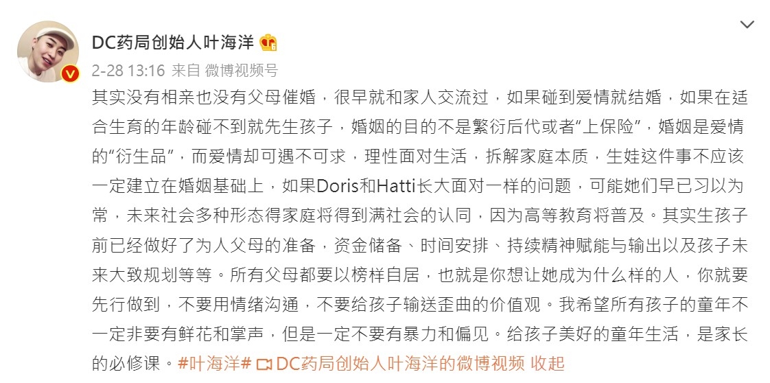 葉海洋誕下二胎後一直飽受批評,日前她就在微博發文回應網民,提到自己其實沒有相親也沒有被父母逼婚,很早就與父母提過如果自己遇到適合的人就會結婚,如果未遇到也會先生孩子,強調「婚姻的目的不是繁衍後代」,生孩子這件事不一定要建立在婚姻上。