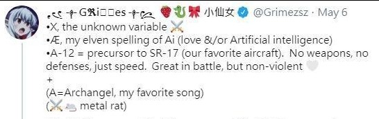 除了關注Elon Musk的生活狀況外,網民亦熱議起Elon Musk和Grimes女兒的名字,因為他們的兒子出生時,宣布名字是「X Æ A-12 Musk」,引來全世界的困惑這個名字應該怎麼發音和解釋,其後Grimes曾親自在Twitter透露,兒子簡稱是「X寶寶」,而「X」代表「未知數」,「Æ」是精靈字母「Ai」,意思為愛與人工智慧,至於A-Xii是A-12,也就是她與馬斯克最愛的飛機SR-71「黑鳥」偵查機的前身。