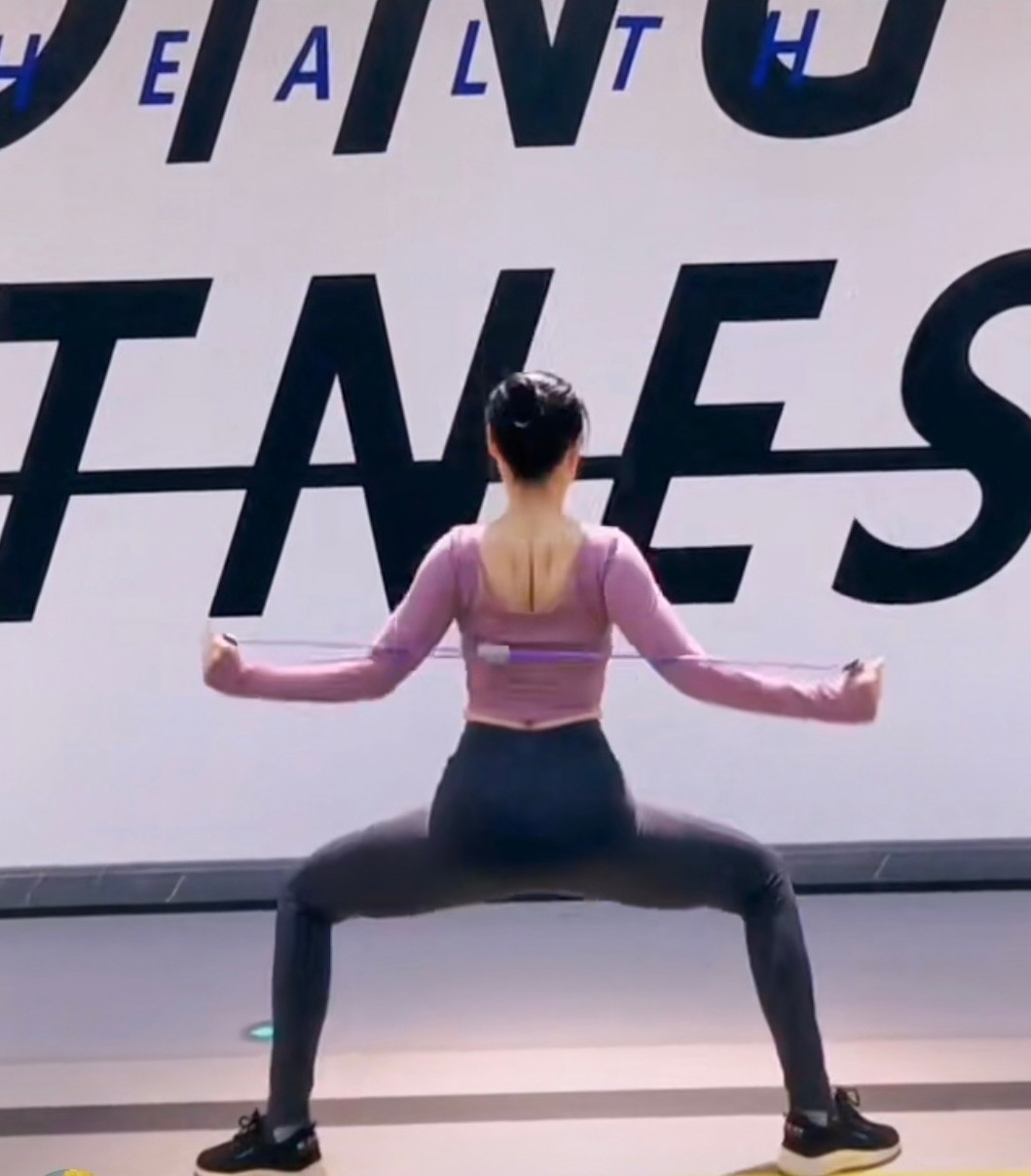 3. 同樣做出上面第2個動作後,再用雙手利用彈力帶作輔助,在向下蹲的時候將彈力帶向後拉,除了可以訓練手臂線條,更可以令到肩、背部的線條更明顯。另外如果沒有彈力帶,也可以以雙手張大畫圈代替,每天做50下就可以。