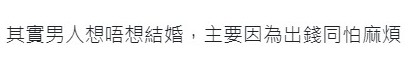 有網民就覺得即使沒有錢也可以商量舉行簡單的婚禮,甚至是女方亦可主動分擔費用,認為沒錢最多延後婚事,因為這個原因就一直拖著不結婚並不合理。