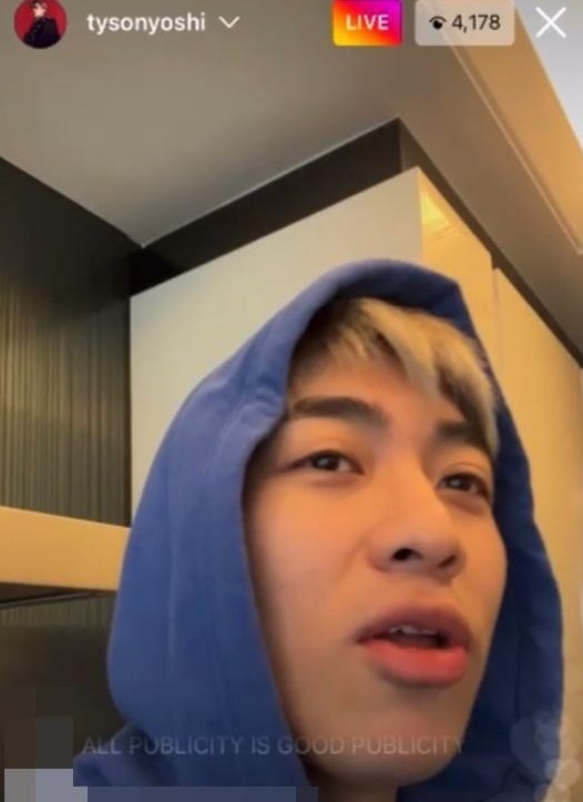 而Tyson Yoshi眼見女友屢被攻擊,終於忍不住在IG開直播替Christy反擊網民,直言「好樣衰?咁點呀?我鍾意呀」,其後又以韓國作為例子,直指有很多因為網路霸凌而輕生的例子,批評「鍵盤俠」做事常常不顧後果,直言「好彩我女友夠堅強,若果佢唔開心,走咗去,咁點呀?」即使直播有4000多人觀看,他也按耐不住激動言論,多次需要飲水嘗試平復情緒。