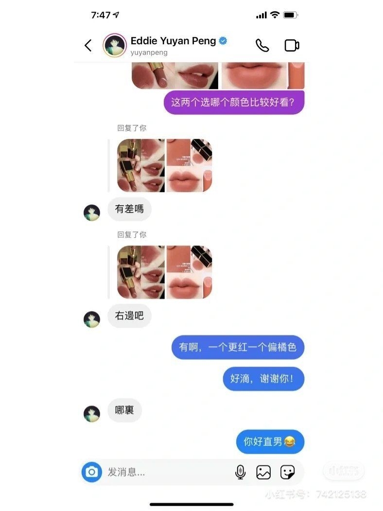 網民除了會分享自己的日常生活照外,又會叫男神幫忙挑選衣服、口紅顏色等,最好笑的是有網民問男神「口紅顏色哪個好看?」彭于晏竟然回覆「有差嗎?」,網民解釋左邊的口紅顏色偏紅,右邊的偏橘色後,彭于晏再次回覆「哪裡」,令網民哭笑不得,直指對方是直男。