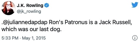 在《哈利波特》的魔法世界裡, 巫師的護法獸著他們的靈魂,而相戀的巫師護法亦會成雙成對,像是哈利的父母在電影中的護法獸就分別是雄鹿和母鹿,而妙麗的護法獸是水獺,後來J.K羅琳亦透露榮恩的護法獸是羅素梗犬,這種狗的特性是喜歡追逐水獺,因此早就注定了榮恩和妙麗這份你追我逐的愛情,不少影迷書迷都表示這個「彩蛋」十分浪漫。