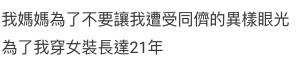 近日台灣一篇討論區的文章引起熱議, 一名21歲女子表示自己日前被告知一起生活了多年的「媽媽」真正身份是一名男同志,因想讓孩子覺得自己的家庭和別人無異,多年來竟悉心打扮成女性外表瞞騙女兒。
