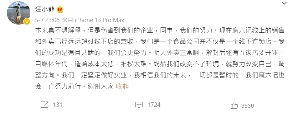 事件發酵不久,汪小菲就親自在微博闢謠,指自己旗下的餐廳並沒有面臨破產的危機。相反,「麻六記」的線上銷售與外賣已經超過了門店的收入,也就是暗示「麻六記」的營運並不用依靠門店的收入,不會受到疫情的影響。