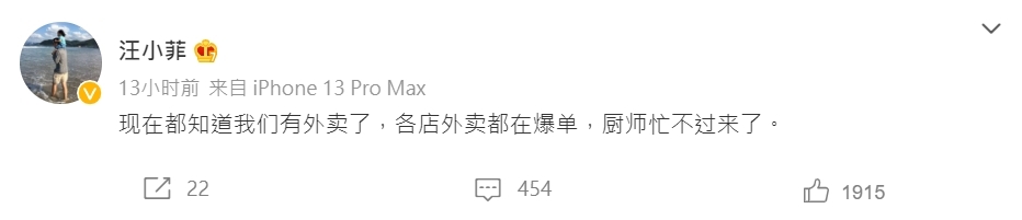 汪小菲更說解封以後將會再開5家分店。第二天早上更發文表示,這場風波令更多人得知「麻六記」有外賣服務,因此大量訂單湧入,後廚都忙不過來,擊破破產傳聞~