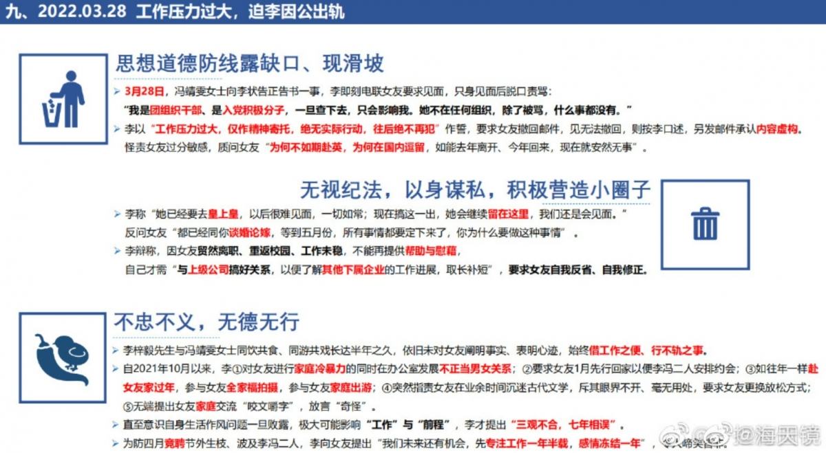 女生提供了大量出軌證據以後,還幫大家整理好所有資料的「主旨」,對男方公司指出男方道德上有問題,要求辭退這名沒有德行的男人。